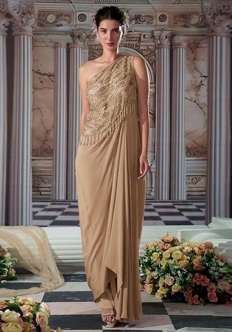 Brown Embroidered Handwork Pre Draped Saree Set