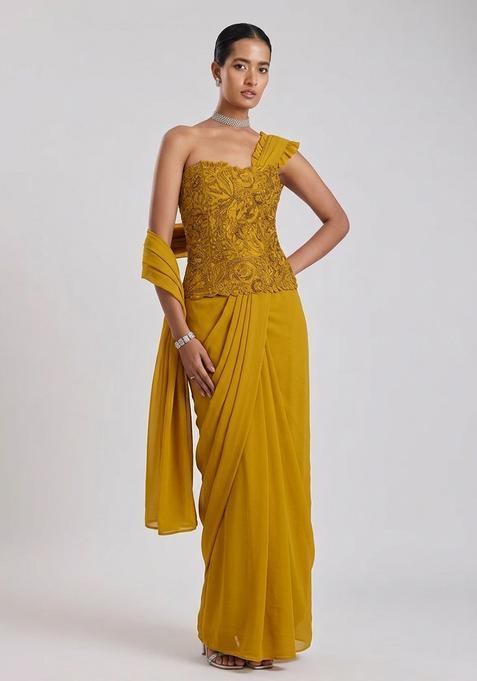 Mustard Yellow Embroidered Handwork Pre Draped Saree Set